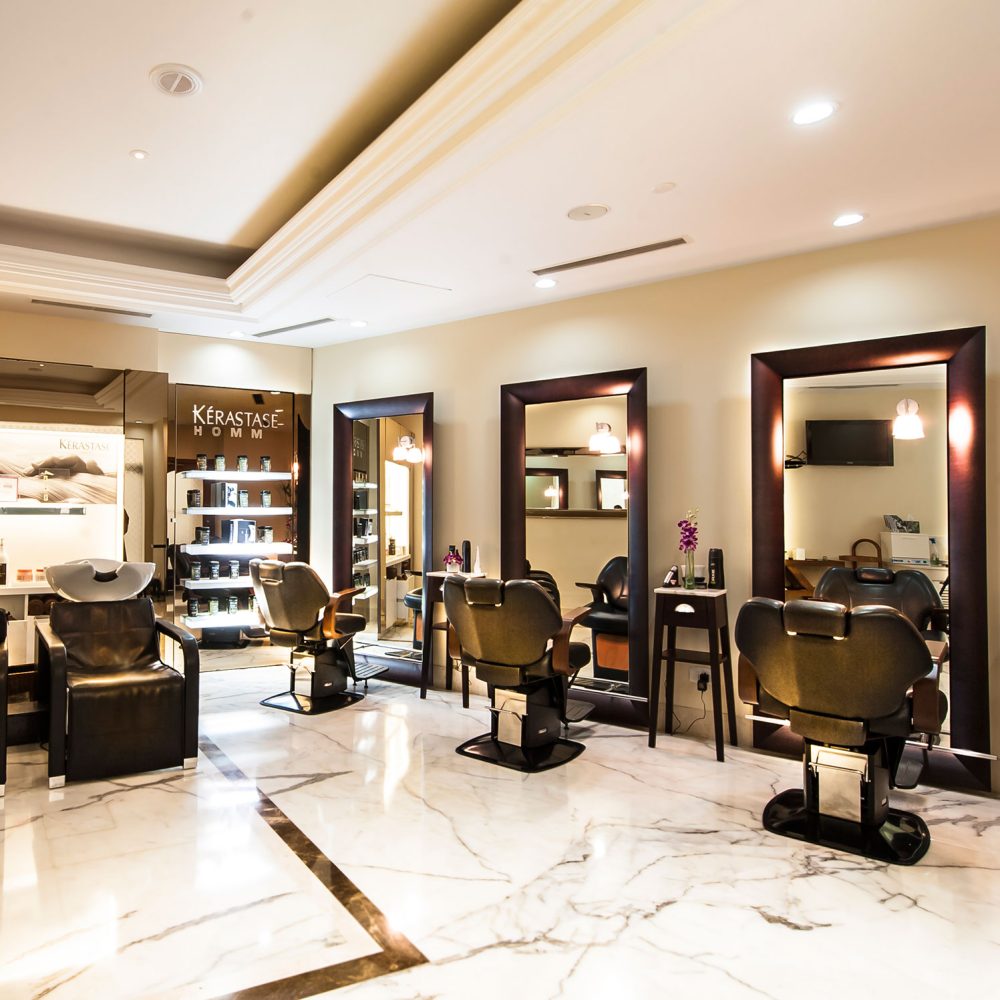 For gentlemen, the sleek London-style men’s area boasts a refined ambiance with chic décor and plush dark leather chairs. Here, high-quality grooming services take center stage, from expert trims and precision haircuts to sophisticated beard styling.